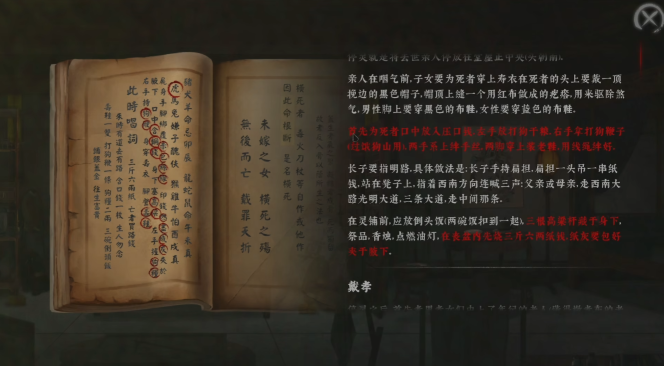 有多详细?你可能无法想象在游戏中直接参与做白事的过程有多刺激!游戏前期有段故事就是让玩家扮演主角许四九为死人做白事,考虑到可能会有玩家对白事流程了解不深,制作组甚至在流程中添加了极为详细的白事过程解答,并且将重要的部分记录下来提供给玩家参考,考虑的可真周到啊。