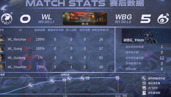 进入下半局,WBG监管者WBG_Ymm掏出经典梦之女巫,这几乎也是WBG_Ymm的招牌之一,算得上对上半场WL选绝活的回应。很明显WBG这边更秀,面对WL的大副、心理学家、杂技演员和勘探员的阵容,WBG_Ymm稳定控场逐个击破,直接完成4抓。而第一局的总比分也因此来到了10:0,让比赛过早的失去了悬念。