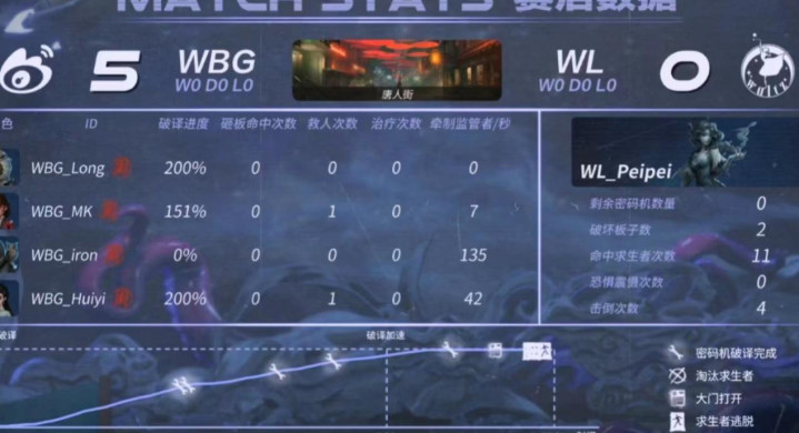 第2比赛日的WBG就很好的贯彻了这一点。作为第五人格职业联赛IVL的人气队伍,WBG的实力一直都在争冠之列,他们本轮的对手是民间队伍WL。而这一把,他们甚至打出了第五人格COAVI中国大陆赛区预选赛开赛以来最为悬殊的一场对局。