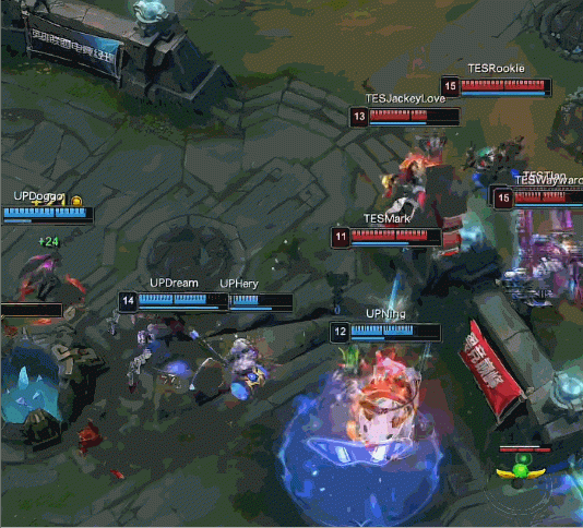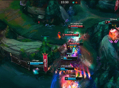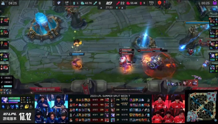 [19:33]Tian大树和Dream塞拉斯分别交出正版盗版大招,但是UP想强进被TES上辅挡住口子,Wayward奎桑提拉走Ning猪妹,正面UP没有前排了TES趁机反打,随着Rookie杰斯双杀,TES打出1换4!