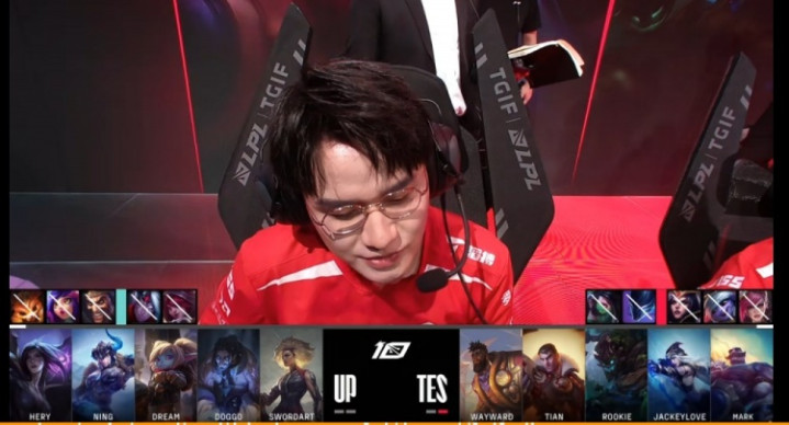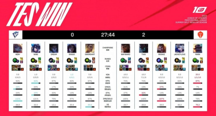 TES:上单Wayward、打野Tian、中单Rookie、下路JackeyLove、辅助Mark