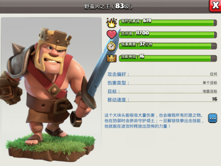 蛮王作为我们最先接触的英雄,却没有获得相应的待遇,因为在前期谁也不喜欢只能近身攻击的“蛮王”甚至有的小伙伴认为一个蛮王都不如“皮卡”好用,在小白刚刚抵达部落的时候也有这样的想法,但这仅仅只是“低本”时期的卓见,到了高本以后“蛮王”的作用就体现了出来,特别是你的“蛮王”达到万血以后,清边能力无人能及,为你节约了多少兵种提高了多少胜率,所以小伙伴们千万不要有“重女轻男”的想法。