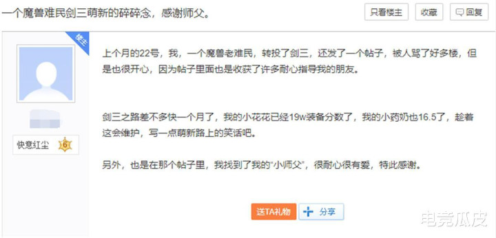 事实上在接引人计划开启之前,WOWer就在剑网三里获得了老玩家级别的待遇,不少WOWer更是自发的去论坛上发帖,组织更多人加入剑三,主要原因除了觉得剑三游戏框架和魔兽相似容易上手之外,游戏中玩家们的氛围也非常好,这也是WOWer们最看重的一点。还有老玩家针对这段时间各款游戏的拉人操作进行了总结,结果铺天盖地的宣传反而获得了反效果,反倒是让剑网三刷了一波好感。