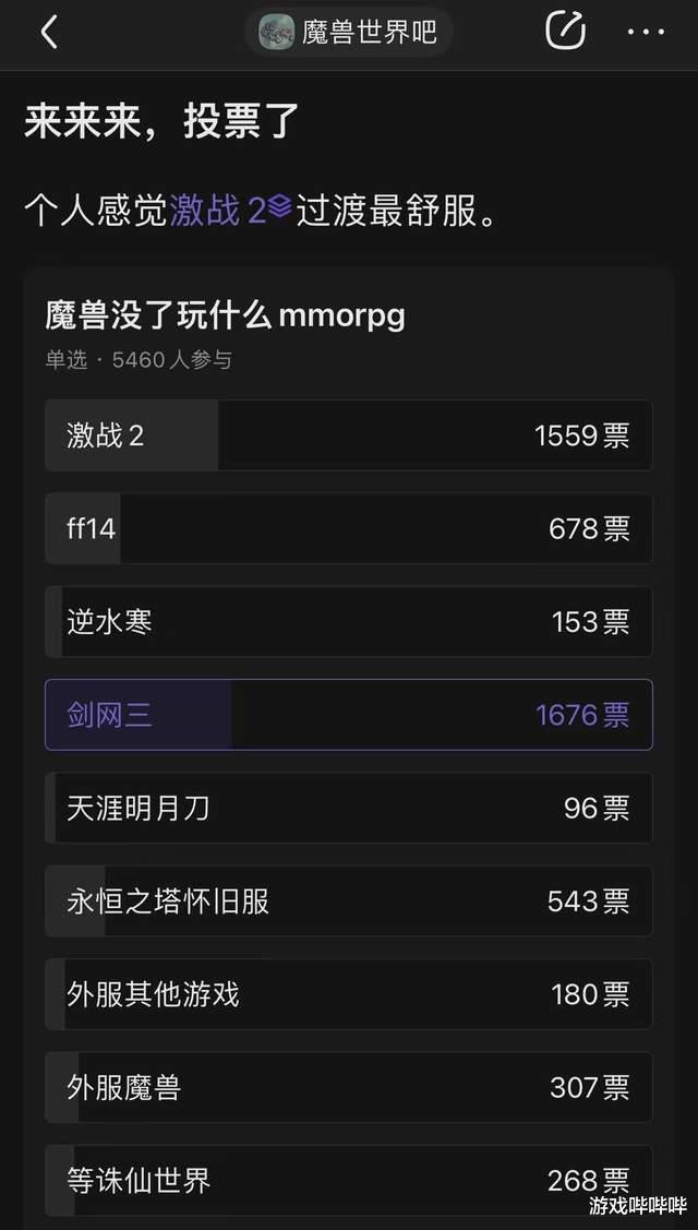 说剑三是魔兽在国内最强劲的竞品游戏并非是空穴来风——有名Wower曾在关服前于魔兽世界吧发布了一个投票贴,意在调查关服之后魔兽玩家的意向去处,其中剑网三的投票数排名高居第一。