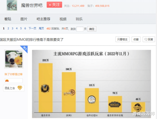 据数据显示,去年11月份主流MMORPG游戏的活跃玩家人数排名,魔兽世界(不带怀旧服)以232万的活跃玩家数稳坐第一,剑网三则是拥有190万活跃玩家,位居第二。