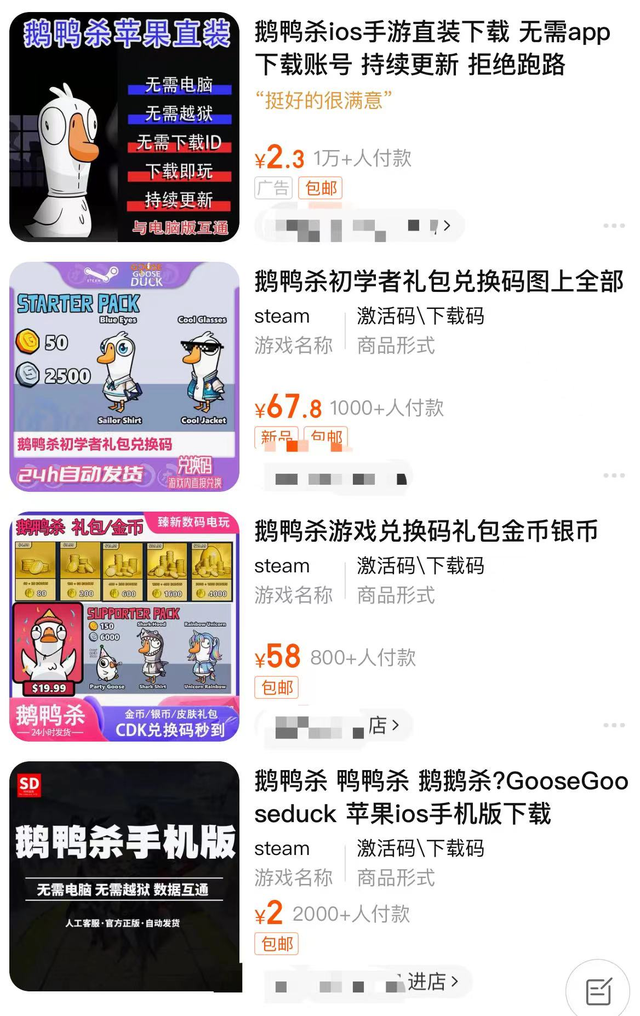 迄今,“鹅鸭杀iOS 手游直装”、“初学者礼包兑换码”、“礼包金币”等相关商品在淘宝销售最高破万。暂不论产品真假,玩家对《鹅鸭杀》开启了全方位的需求。