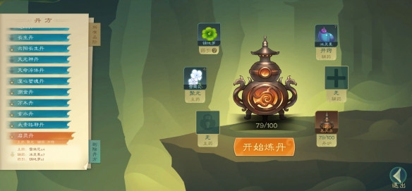 不同的药材在当主药、辅药、药引时会有对应的药性、药力、冷热属性,炼丹本质上就是一个尝试组合不同的灵药,让丹药最终能药性正确、药力足够、冷热中和的过程。