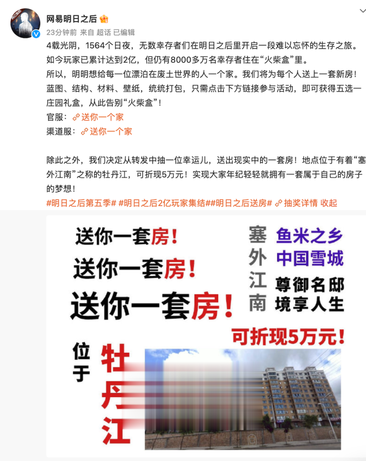 IT之家2月23日消息,网易今日举行《明日之后》累计玩家达2亿的庆祝活动,除了在游戏中送出福利之外,官方还宣布送出现实中的一套房,地点位于有着“塞外江南”之称的牡丹江,可折现5万元。