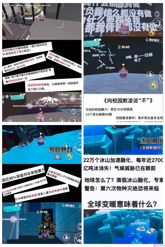 我们甚至能看到不少玩家自制关卡用精巧的构思去反映社会问题,以及对价值观的探讨。例如反映流浪动物被虐待、抵制校园霸凌、甚至还有展示全球变暖后北极冰山融化景象的关卡,这些发人深思的优质内容通过玩家之间的传播逐渐扩展影响力,也正是这样开放的UGC生态更是将《蛋仔派对》的社会价值进一步拔高。