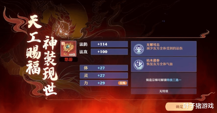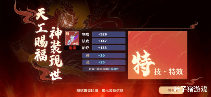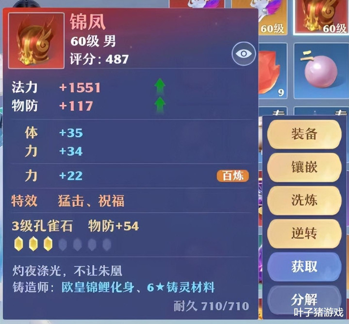这个60级帽子百炼属性虽然不是很高,只有22点,但是力属性和这个装备契合度特别高,如果是别的属性,再高也没有用,剩下的就是这个装备最重要的特效了,祝福特效让装备的基础属性得到跃升。
